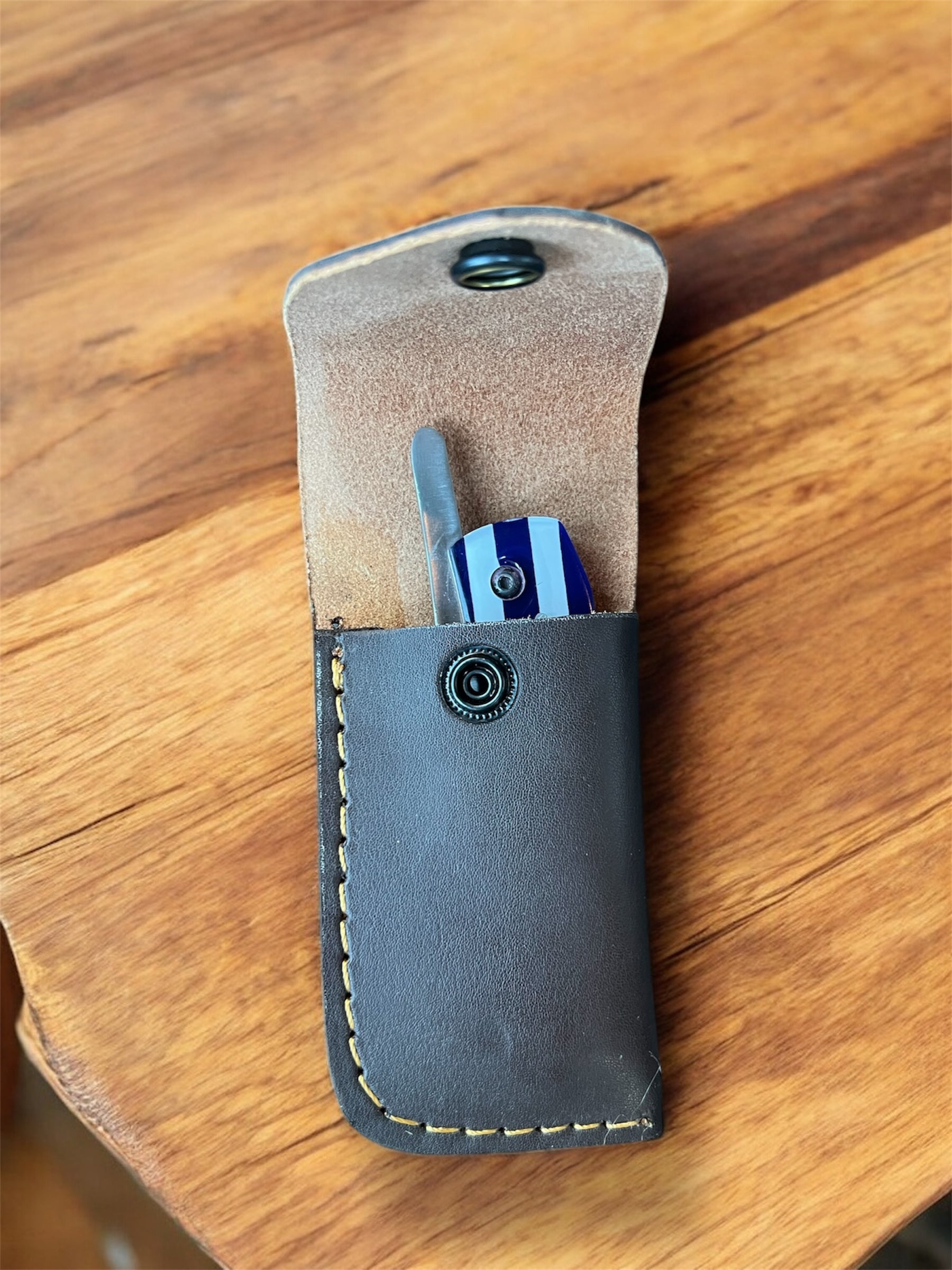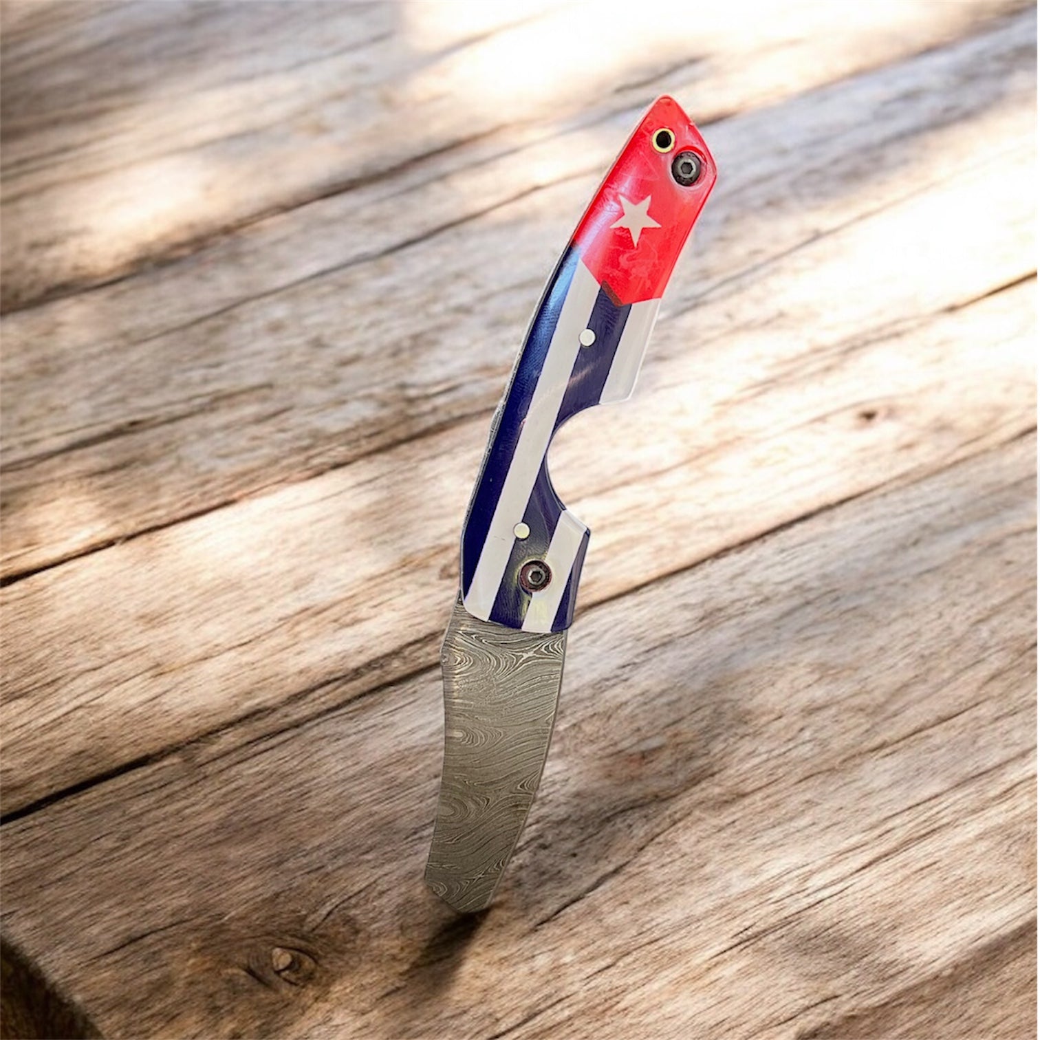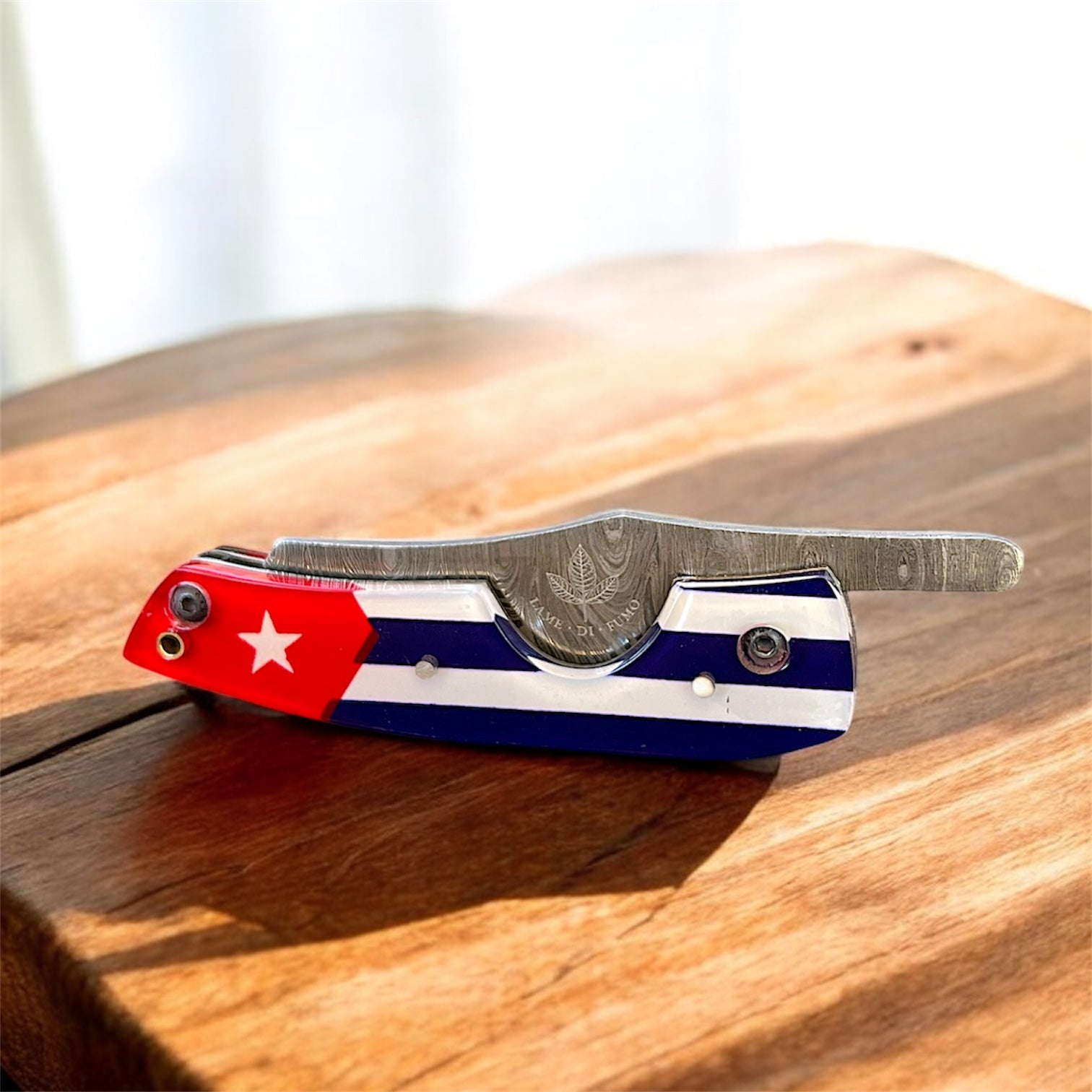 The Edge. Crafted for enthusiasts of fine tobacco, this Damascus Steel Folding Cigar Cutter is a sleek accessory for your smoking collection. The design combines utility and elegance, making it not just a tool but a piece to cherish for its craftsmanship. Ideal for those who appreciate the ritual of cigar enjoyment, this cutters compact folding mechanism allows for easy storage and portability, while the damascus steel construction promises durability and longevity. A must-have for any connoisseur's tobacciana collection. comes with free leather carry pouch! |