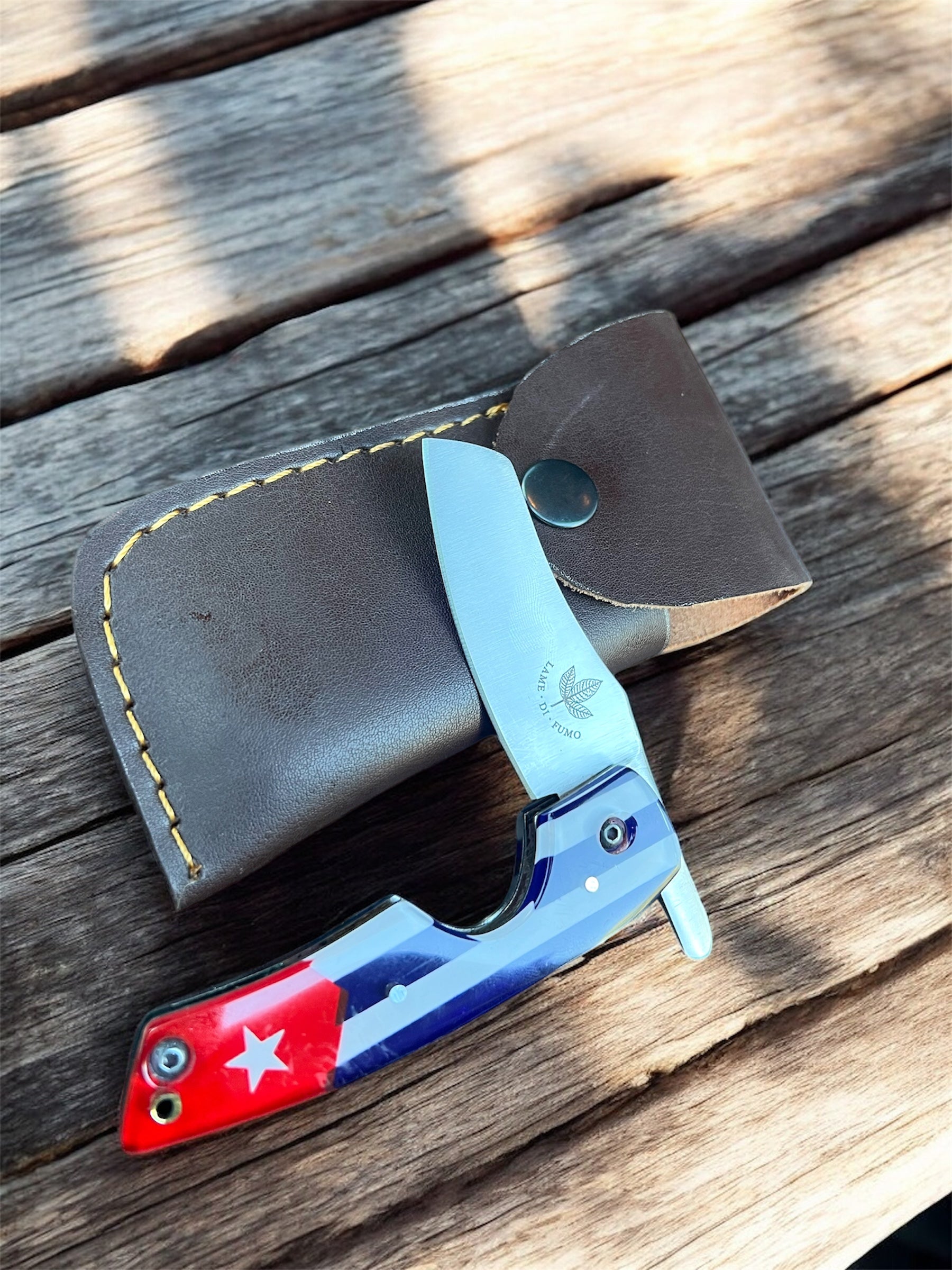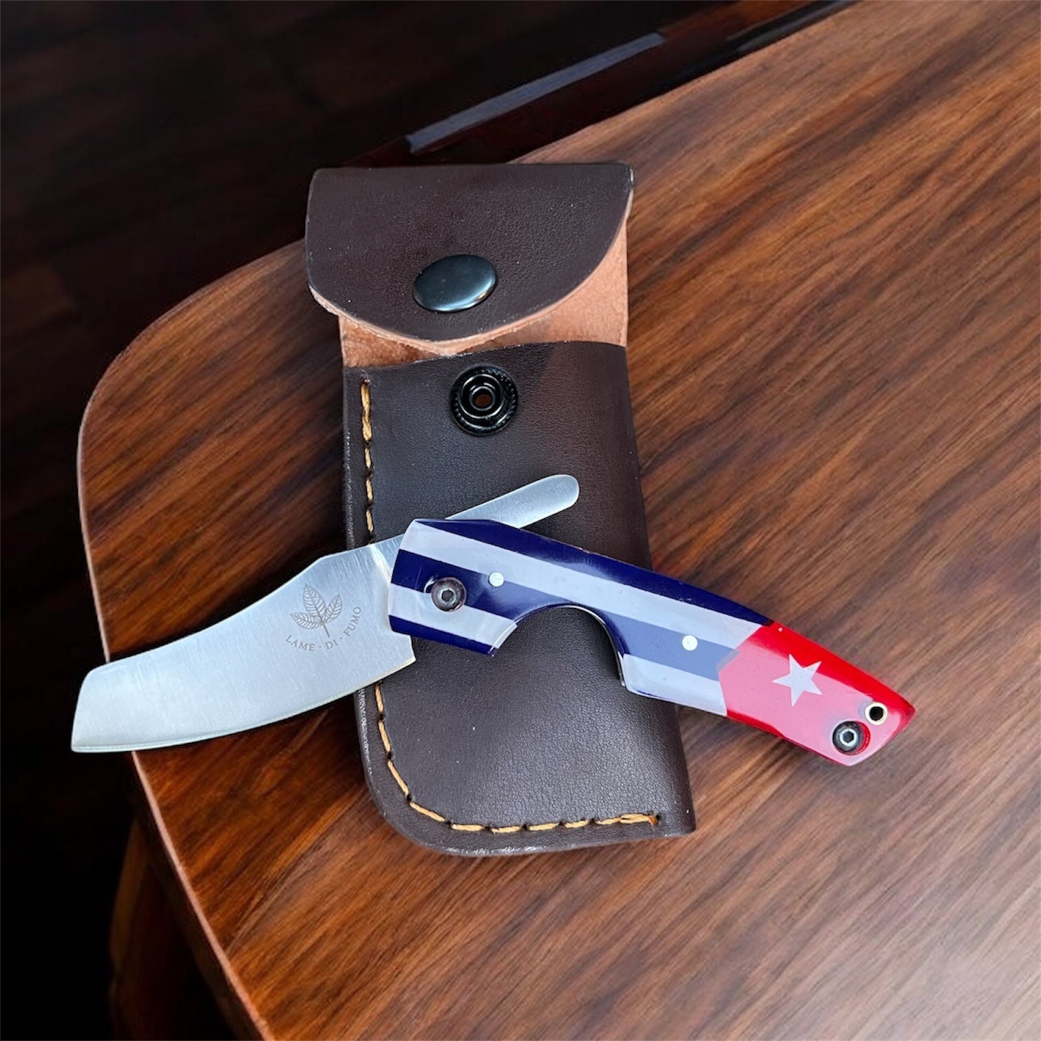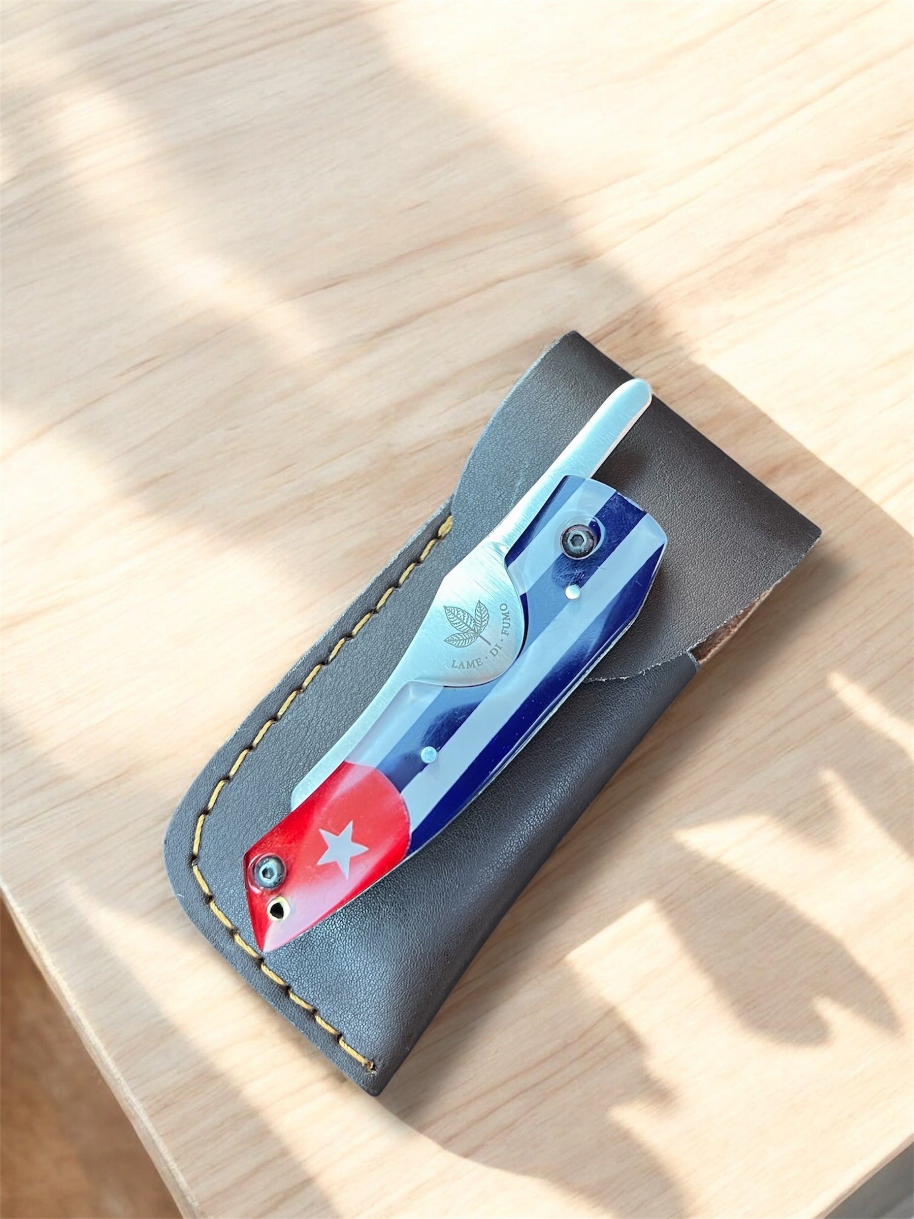 The Edge. Crafted for enthusiasts of fine tobacco, this stainless Steel Folding Cigar Cutter is a sleek accessory for your smoking collection. The design combines utility and elegance, making it not just a tool but a piece to cherish for its craftsmanship. Ideal for those who appreciate the ritual of cigar enjoyment, this cutters compact folding mechanism allows for easy storage and portability, while the stainless steel construction promises durability and longevity. A must-have for any connoisseur's tobacciana collection. comes with free leather carry pouch! |